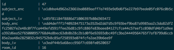 Well, she can look, but all she will see is the encrypted data. Remember that your password is needed to access the key which encrypts the confidential data. The example below shows how the confidential subject and body of a typical message appear in the database; the long strings of random-looking numbers and letters are the encrypted subject and body of the message. Without the key, it is cryptographically impossible to reveal the original text.